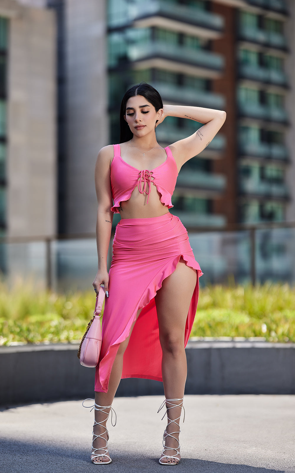 El top con tirantes es el complemento perfecto para esta falda, ya que su diseño sencillo y moderno resalta la belleza de la prenda inferior. El conjunto está disponible en tres colores vibrantes y en tendencia: rosa, verde y morado, para que puedas elegir el que mejor se adapte a tu estilo y personalidad.